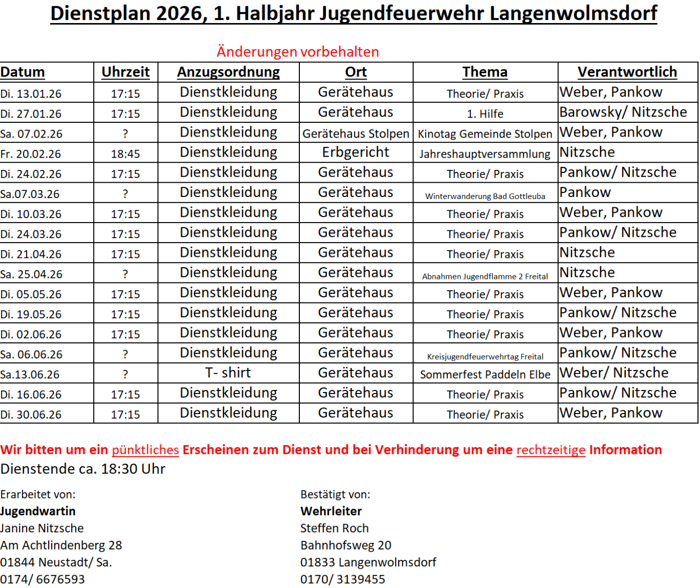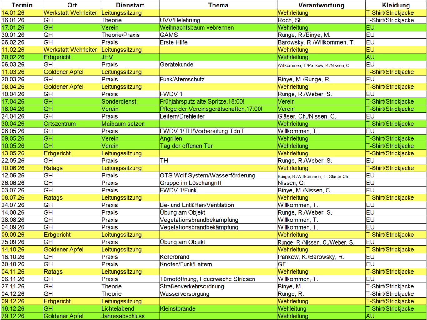 Wer nicht am Dienst teilnehmen kann, hat sich rechtzeitig (eine Woche vorher) beim Wehrleiter abzumelden!